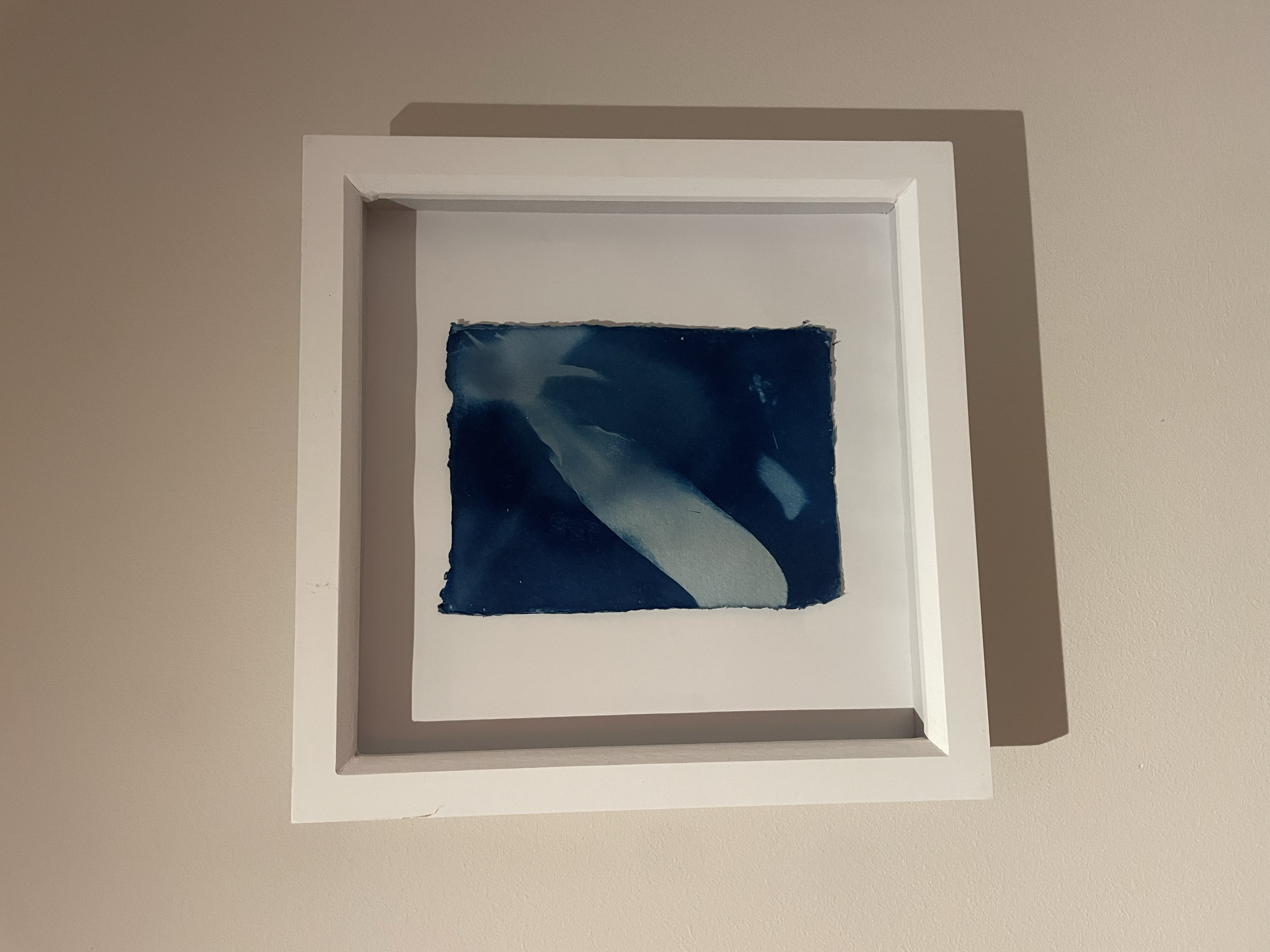 First displayed in the carousel is the reverse side of a developed cyanotype print, we expect the deep blue side is there, yet we cannot see it, nor confirm it. The chemicals that have seeped through the paper are visible, and tangibly connected to the other side. The abstract result, conjures visuals of clouds, light leaks and the sky. A white feather, (attached to the outside of the glass of the frame) can be symbolically linked to a spiritual presence, guidance on one’s path, transcendence and freedom. The feather casts a moving shadow depending on viewing position and lighting in which the print is viewed, hinting at the temporary nature of life.
