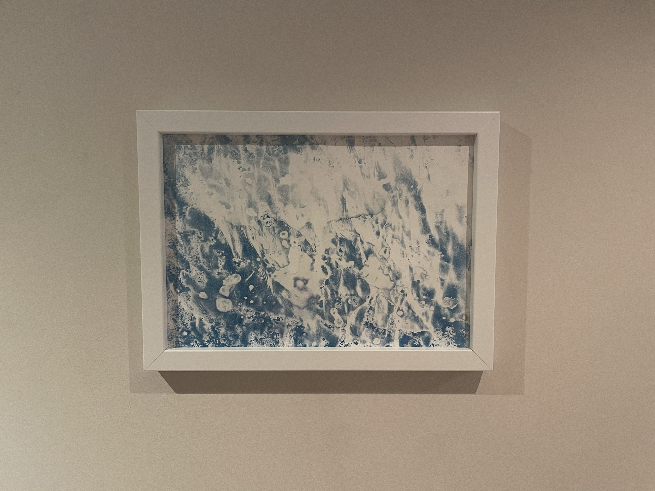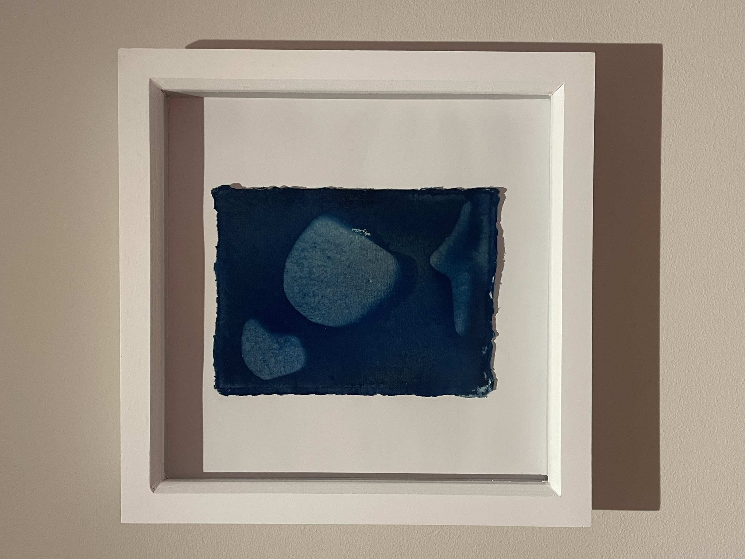 The work is the result of collecting natural items off the shore such as pebbles, shells and sand which were then placed on paper coated with cyanotype chemicals. Once the cyanotype had been exposed, seawater was collected from the same shoreline and then used to rinse off the chemicals, finishing off the development process.