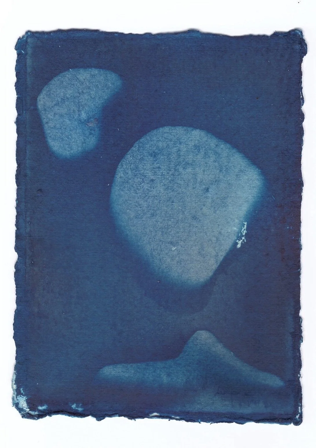 The work is the result of collecting natural items off the shore such as pebbles, shells and sand which were then placed on paper coated with cyanotype chemicals. Once the cyanotype had been exposed, seawater was collected from the same shoreline and then used to rinse off the chemicals, finishing off the development process.